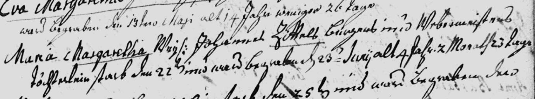 Maria Margaretha Weil. Johannes Zittels Bürgers und Webermeisters Töchterlein starb den 22ten und wurde begraben den 23ten Juni, alt 4 Jahr u. 2 Monath 23 Tage |
